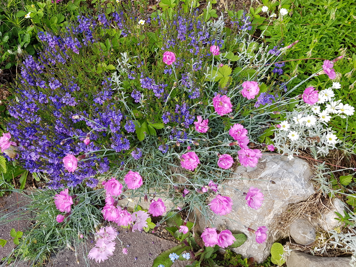 Wir haben zwei Arten Ehrenpreis am Hang, einmal ein Polster-Ehrenpreis, einmal ein etwas höheres und beide kommen am Trockenhang gut klar.